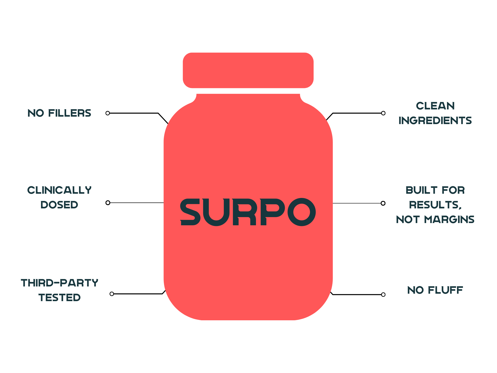 At SURPO, we do things differently. We invest where it matters: into higher doses, better flavor, clean formulas, and quality manufacturing standards.